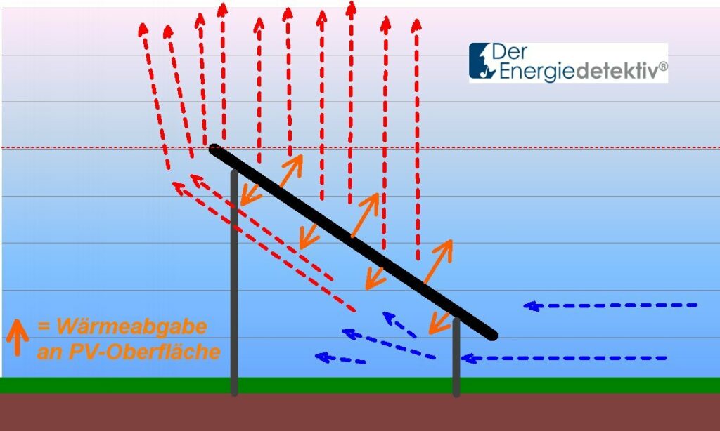 Aufgrund der erhöhten Temperatur wird die an den PV-Oberflächen anliegende Umgebungsluft erwärmt. Diese steigt auf und setzt dabei eine Luftströmung in Gang, bei der bodennahe kältere Luft angezogen wird und diese ihrerseits an den PV-Oberflächen entlangströmt, erwärmt wird und damit weitere Luft anzieht.